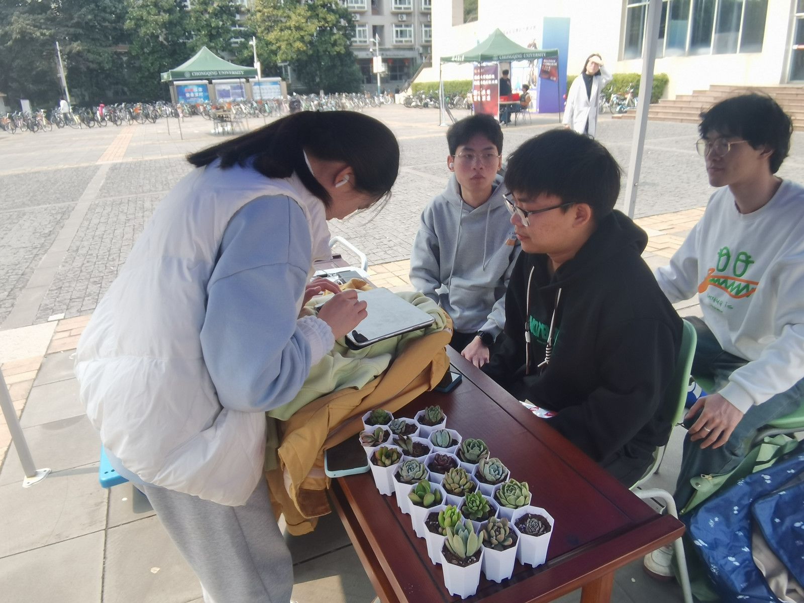 活动现场,捐赠点前人头攒动,同学们纷纷献出爱心,将闲置的衣物捐出,为山区的孩子们送去温暖与关爱。志愿者们则以饱满的热情接待每一位前来捐赠的同学,耐心解答疑问,传递着温暖与善意。此外,为了感谢同学们的善举,志愿者们还精心准备了多肉盆栽,为活动现场增添了一抹生机勃勃的绿色。
