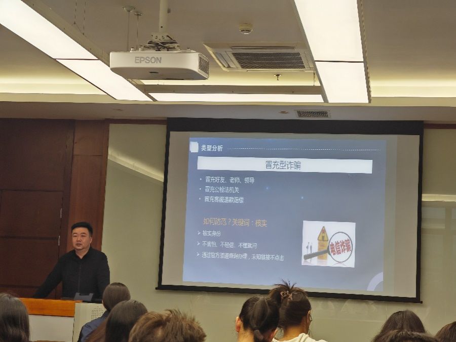 在两场专题讲座中,刘郅老师结合自身在保卫处的工作经历,根据本科生、研究生的不同特点,从不同角度作为切入点,向同学们详细讲解了各类常见的诈骗手段和方式,并针对性地讲授了相应的防范措施。他指出,对于网络交友复合型诈骗,请同学们务必保持清醒头脑,拒绝诱惑,不参与非法投资活动;对于冒充型诈骗,请同学们务必通过官方渠道或已知联系方式核实对方身份,不轻易转账或提供个人信息;对于虚拟游戏与刷单返利诈骗,请同学们务必警惕游戏内交易风险,不参与非法刷单活动,选择正规平台进行交易。
