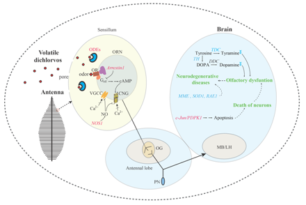 该研究初步揭示了挥发性DDVP引起家蚕嗅觉障碍的发生机制(图2),这为我们理解挥发性杀虫剂等VOCs通过空气传播影响人类嗅觉敏感性并诱发神经退行性疾病的发生机制具有重要的参考价值。