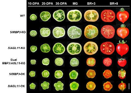该研究基于前期相关研究基础,通过DNA测序发现了6个全果肉型番茄品种的MADS-box基因SlMBP3的启动子都出现了405bp的缺失突变,同时研究团队进一步通过基因回复、CRISPR/cas9敲除以及结合RNA-seq和ChIP-seq等实验证实了SlMBP3是通过调控细胞增殖和膨大从而影响番茄胶质形成的关键因子。研究发现:SlMBP3敲除株系在盛花后10天(10-DAP)就显示出很高的果实硬度并一直持续到成熟,与之相反SlMBP3超表达株系的果实则严重软化,在绿熟之后就进入了液化状态。另外,SlMBP3-KO果实还具有货架期长、糖和干物质含量高等特性。通过DNA测序分析进一步发现,SlMBP3的同源基因SlAGL11, 也同样存在着基因座完全缺失的自然突变情况。于是,研究团队利用CRISPR/cas9对这两个同源的基因SlMBP3和SlAGL11进行了双敲除,研究结果发现双敲株系表现出:植株矮化,果实变小和种子畸形等,这些性状大大限制了其商业应用潜力。