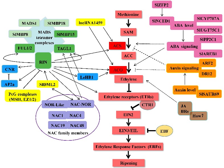 果实是人类膳食中必需营养的重要来源,色泽、风味等果实品质指标主要发生在成熟过程,使得果实对消费者更有吸引力。了解肉质类果实成熟的分子调控网络不仅对提高果实品质,而且对延长采后货架期都具有重要意义。植物激素乙烯在呼吸跃变型果实成熟过程中发挥着重要的作用,乙烯通过调控参与多种生物学过程的基因表达来调节果实的成熟,包括呼吸作用的增强、自催化乙烯的产生、色素的积累、质地的改善和果实品质的形成。大量研究表明乙烯信号元件及相关转录因子参与了果实成熟的调控,但乙烯与其他激素信号的相互作用在果实成熟的调控网络中还尚未不清楚。本文以番茄为参考物种,从分子和生理两个层面全面阐述了乙烯在番茄果实成熟过程中的作用,对乙烯与成熟相关转录因子之间的相互作用及其与其他植物激素之间的互作进行了讨论,并分析了成熟相关表观遗传修饰的最新研究进展。本文总结了这一领域的最新研究进展,有助于促进未来研究的发展。