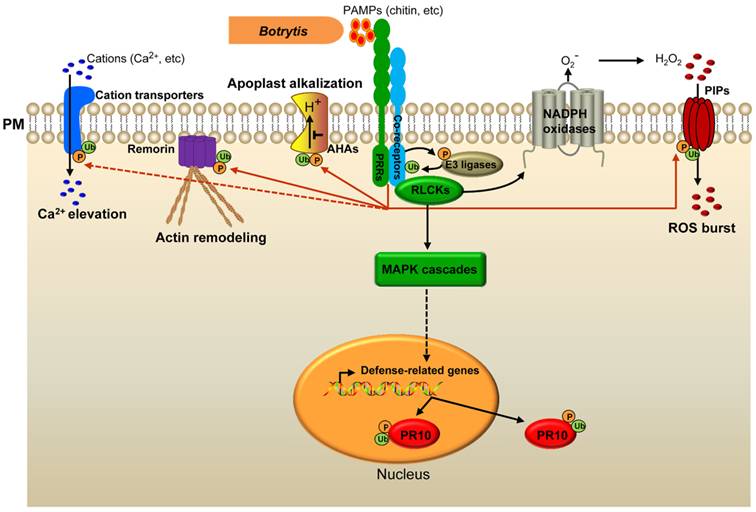 综上,本研究证实了PR10蛋白和PTI信号通路在月季对灰霉病菌侵染的免疫响应中起重要调控作用,同时揭示磷酸化与泛素化的Crosstalk在月季免疫响应中的可能作用机制。