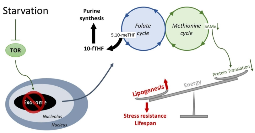 该研究结合遗传学、活体成像、细胞生物学和寿命分析,发现营养匮乏导致RNA外切体关键组分从核仁中流失,伴随其RNA监督功能下降活,表现为特定rRNA前体分子的积累。这种抑制触发了对一碳代谢(1CM)途径的重编程,显著降低了关键代谢物S-腺苷甲硫氨酸(SAMe)的水平,进而抑制了蛋白质翻译过程——这是细胞中最耗能的环节之一。节省下来的能量被重新定向用于油酸等不饱和脂肪酸的合成,它们对于激活多种压力抵抗基因至关重要,从而增强了细胞在营养匮乏条件下的维持能力,并延长寿命。该研究首次揭示了细胞通过主动“牺牲” 看似重要的RNA质量监控系统来换取生存能量的全新策略,为探索长寿机制提供了全新思路。